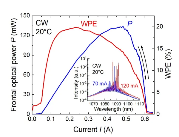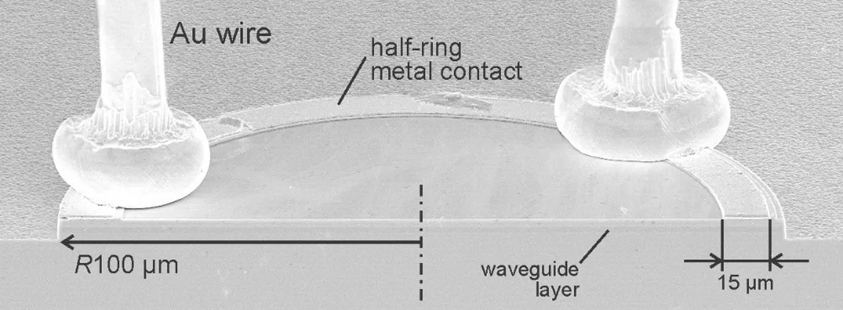 В настоящее время недостатки подавляющего большинства типов микролазеров связаны с малой мощностью и большой расходимостью излучения. Разработаны полудисковые микролазеры диаметром 200 мкм, работающие в непрерывном (134 мВт) и импульсном (1,6 Вт) режимах. Конструкция включает оптимизированную гетероструктуру InGaAs/GaAs, что позволяет минимизировать паразитные оптические моды и улучшить тепловое управление. Максимальный КПД достиг 20%, а предельная температура генерации — 113°C.Применение: