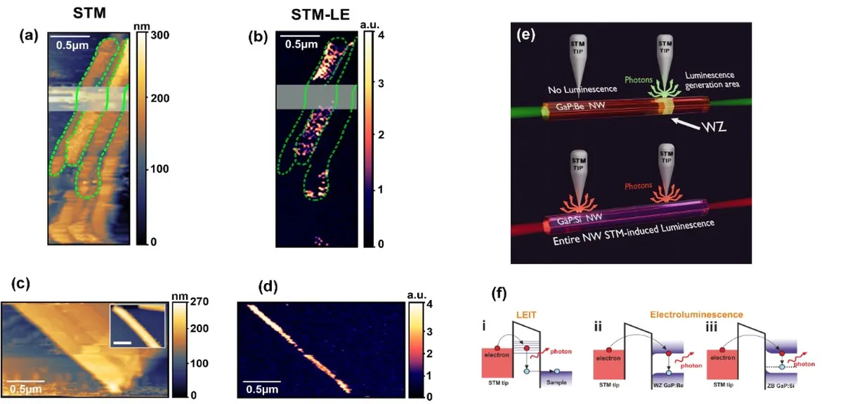 Ключевыми компонентами фотонных интегральных схем являются компактные оптические источники излучения и нановолноводы. Полупроводниковые наноструктуры А3В5 являются наиболее перспективной материальной платформой для таких компонентов из-за высокой эффективности люминесценции и высокого показателя преломления. При этом требуется решение проблемы эффективного ввода излучения в волновод. В данной работе использовались нитевидные нанокристаллы (ННК) GaP с различными типами легирования (GaP:Si или GaP:Be) в качестве оптических волноводов с непосредственно интегрированными электрически управляемыми источниками света. К одиночным ННК формировался туннельный контакт и возбуждалась электролюминесценция. Такой подход обеспечивал как связь источника и волновода, так и изучение оптических свойств ННК на нанометровом масштабе.Применение:
