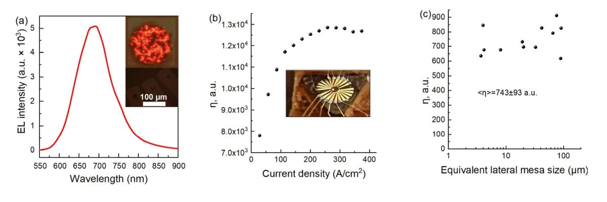 Проект направлен на разработку светоизлучающей полупроводниковой матрицы на основе системы материалов GaP/GaP(N,As), работающей в красно-оранжевом спектральном диапазоне, для ее последующей потенциальной интеграции с управляющей КМОП-транзисторной интегральной схемой. Предполагаемая интеграция обеспечит технологическую базу для создания микродисплеев нового поколения на основе объединения А3В5 и Si технологий. В качестве светоизлучающих структур используются p-i-n светодиоды GaP/GaP(N,As)/GaP, сформированные в виде микротекстурированных тонких пленок (технология сверху-вниз), синтезированных и отделенных от вспомогательных Si подложек.Применение: