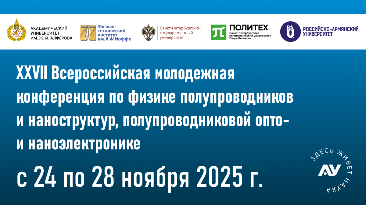 XXVII Всероссийская молодежная конференция по физике полупроводников и наноструктур, полупроводниковой опто- и наноэлектронике состоится в Санкт-Петербурге в период с 24 по 28 ноября 2025 г. на территории Санкт-Петербургского политехнического университета Петра Великого и Академического университета им. Ж.И. Алферова.