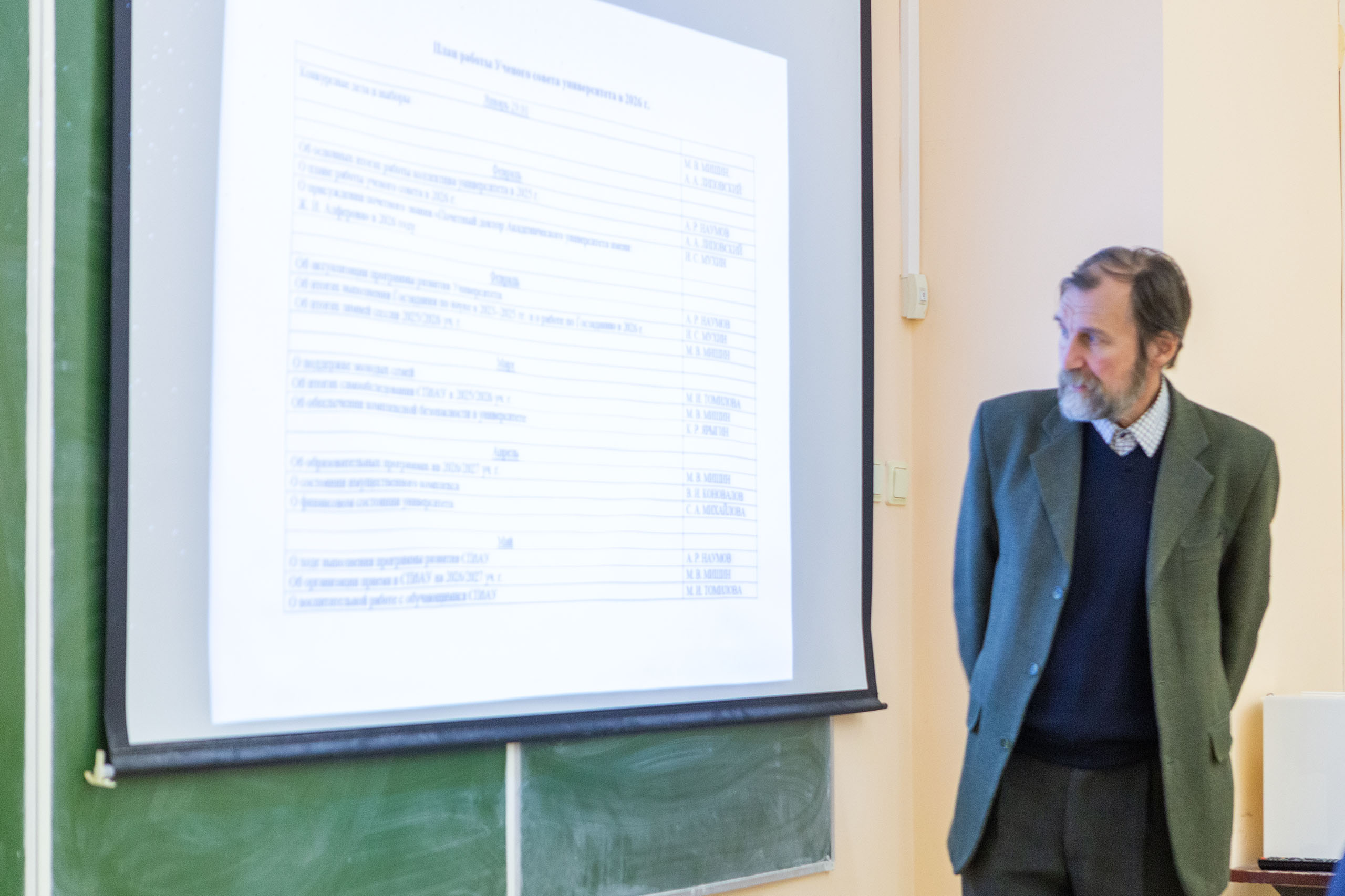 В начале заседания ректор поздравил начальника отдела кадров Елену Николаевну Браславскую с днём рождения и вручил ей благодарность «за добросовестный труд, высокий профессионализм, значительный личный вклад в управление кадровыми процессами и создание благоприятной рабочей атмосферы в университете».