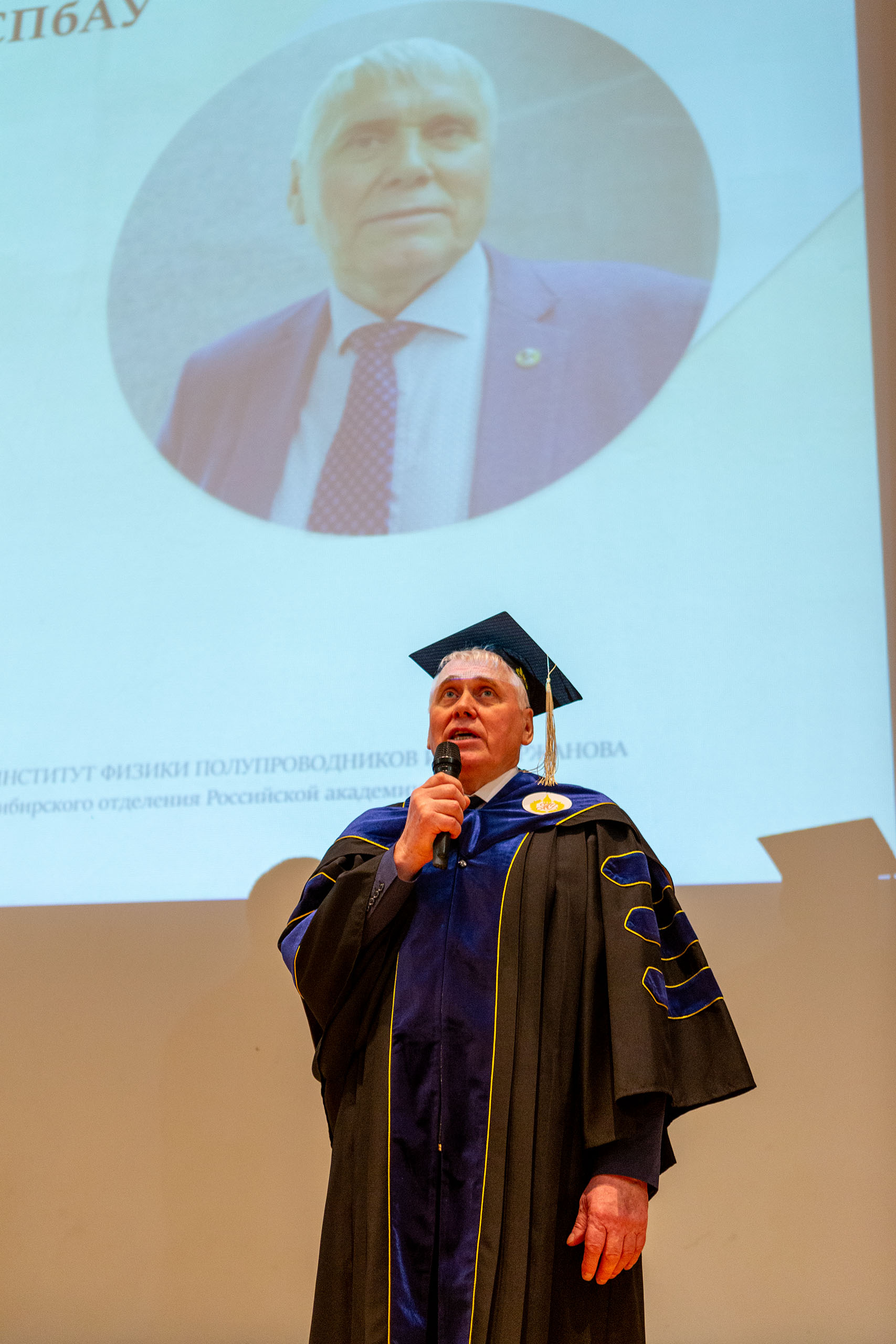 После этого на сцену был приглашён академик Александр Васильевич Латышев — выдающийся учёный в области физики полупроводников и нанотехнологий, директор Института физики полупроводников им. А.В. Ржанова СО РАН и заведующий кафедрой физики полупроводников НГУ. В торжественной обстановке ректор зачитал решение Учёного совета, после чего Александру Васильевичу были вручены мантия и диплом Почётного доктора Академического университета.
