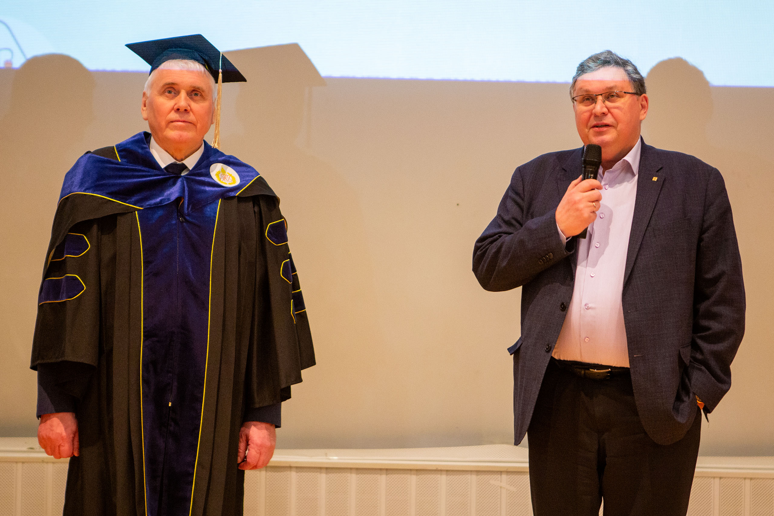Торжество открылось в актовом зале университета. Перед началом церемонии в зале звучала приятная музыка, а на экране демонстрировались фотографии Жореса Ивановича — моменты его научной работы, выступлений и жизни университета. Атмосфера задала особый тон событию, подчеркнув преемственность научных традиций.